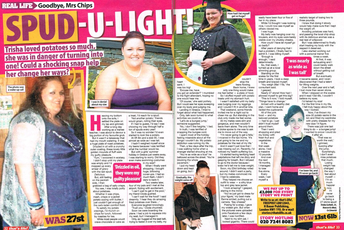 Lovely Trisha shares her story in this week’s That’s Life. She ballooned to a whopping 27st after she scoffed on half a tonne of potatoes per year! Whether it was jacket potatoes, chips or crisps – she just couldn’t get enough. But after giving up the spuds, she’s lost a massive 13st and has never been happier.