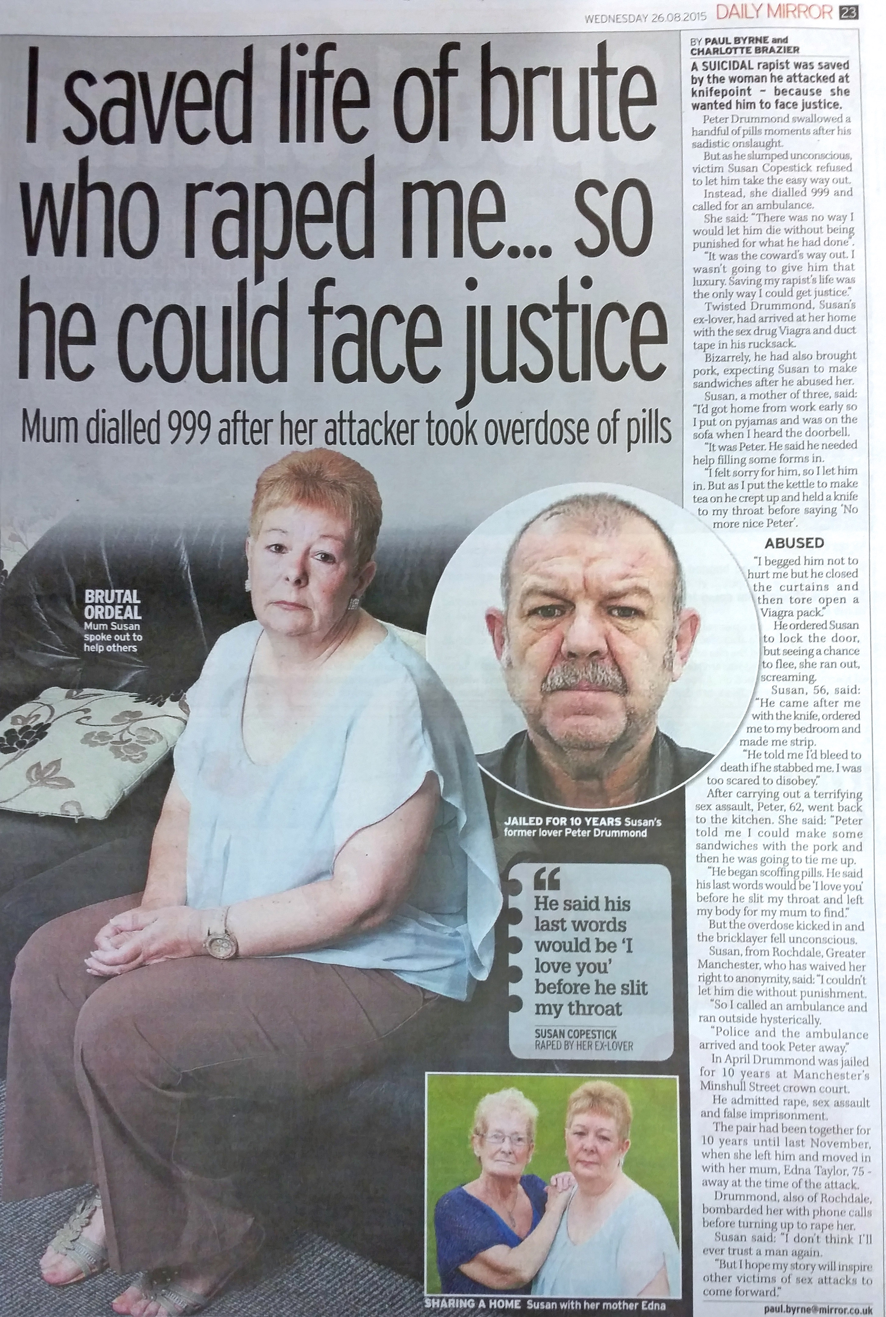 In today’s Mirror, Susan bravely explains why she saved the life of her own rapist. Her attacker, Peter Drummond, brutally raped her in revenge after Susan ended their 10-year relationship. He then tried to commit suicide by overdosing on pills, but Susan was determined that he would face justice for his crime and she rang an ambulance. He was jailed for 10 years in April, giving Susan the closure she needed to move on with her life.