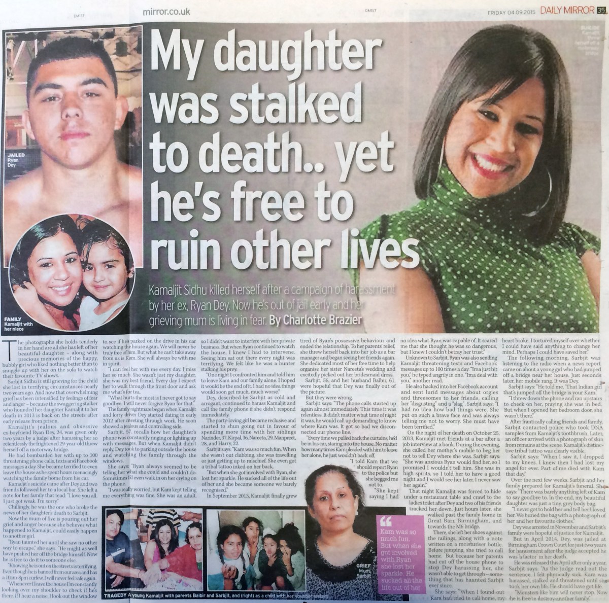 Sarbjit’s beautiful daughter, Kam, threw herself off a motorway bridge after being stalked relentlessly by her ex-boyfriend, Ryan. He sent her hundreds of threatening texts and Facebook messages and sat outside the family house in his car. Now, after just a year in prison, Ryan has been released and Sarbjit is terrified that he will target another innocent woman.