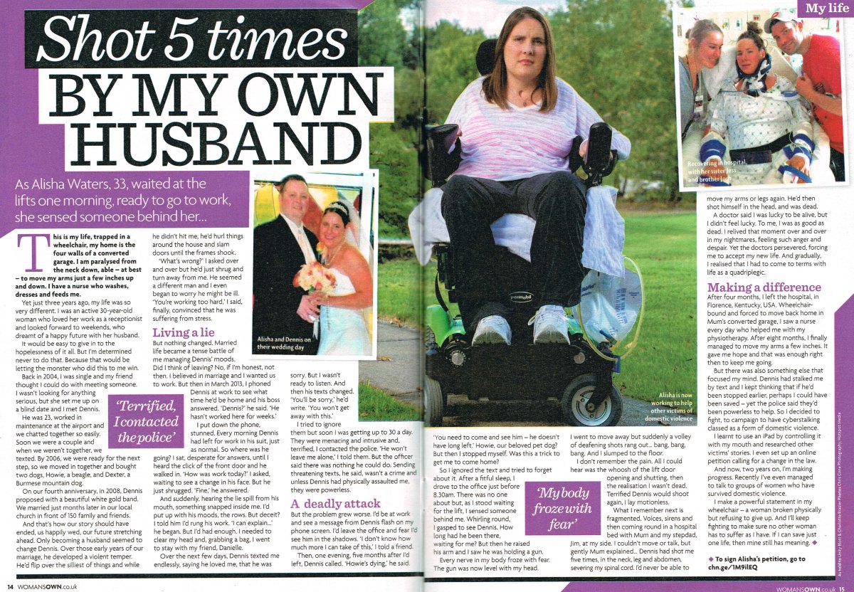 Alisha was shot five times and paralysed by her ex-hubby, DJ, after police failed to take her stalking complaints seriously. Now she’s campaigning for a change in US law.