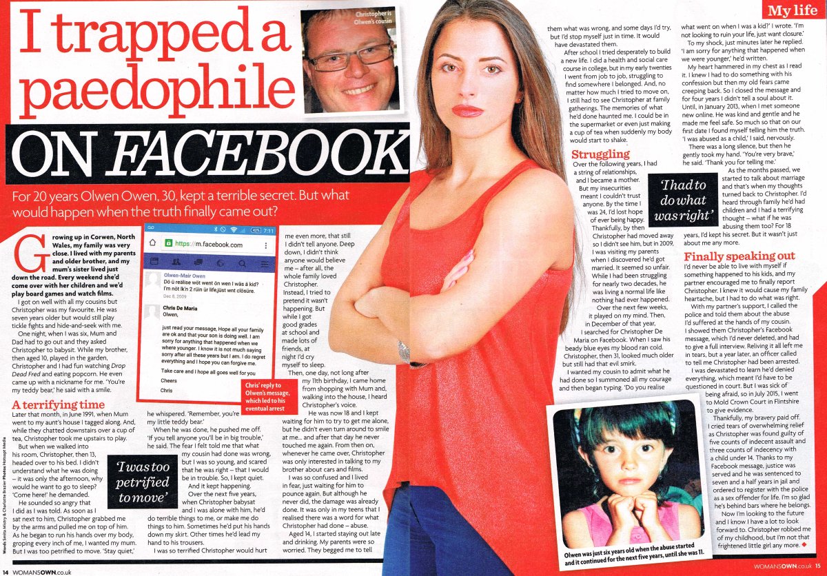 Olwen bravely told Woman’s Own readers how she was sexually abused by her sick cousin, Christopher, who was trusted to babysit her. Although he denied his terrible crimes, his lies unravelled in court when Olwen was able to produce a Facebook message in which he admitted his guilt. Christopher was eventually sentenced to seven-and-a-half years in prison, prompting Olwen to share her story to encourage other sexual abuse survivors to report their attackers.