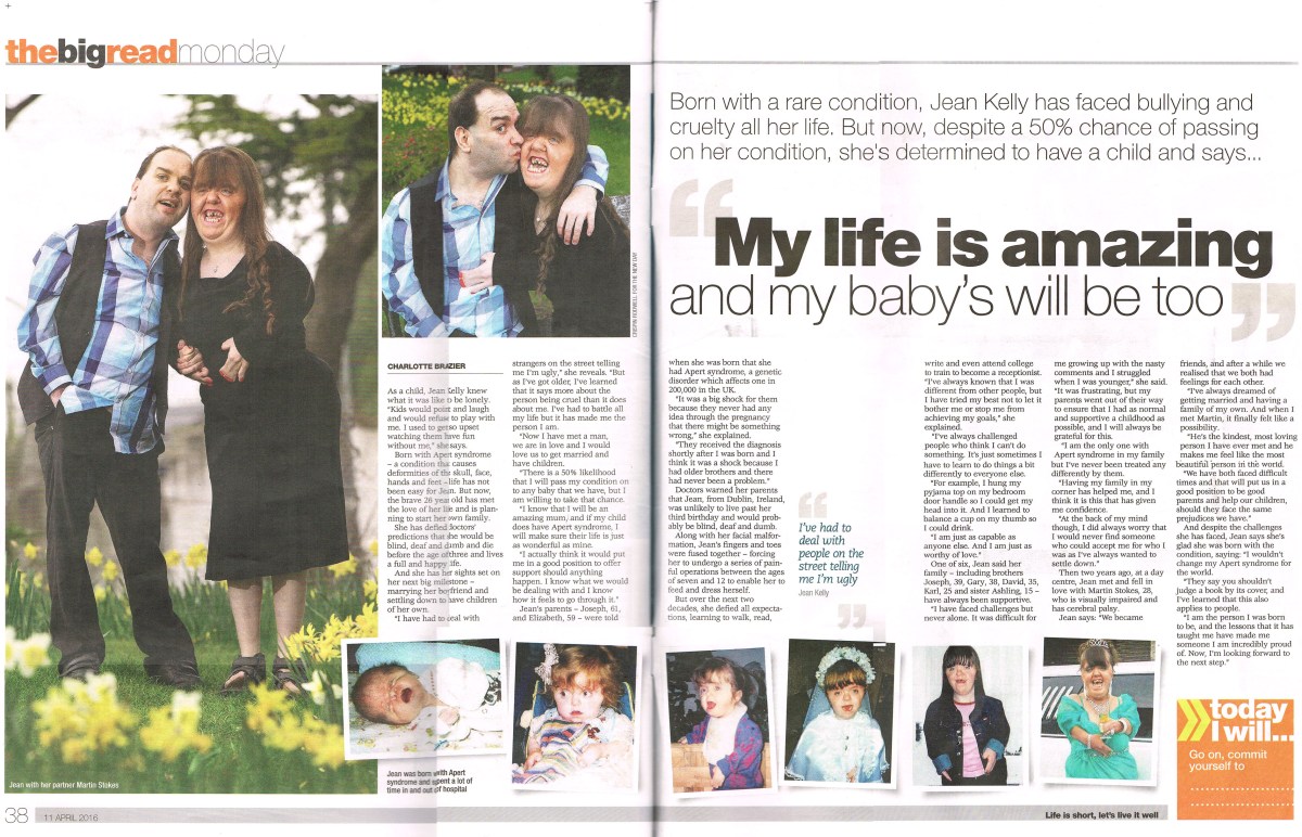 Born with Apert syndrome, Jean has spent her whole life defending herself from cruel bullies who call her ‘ugly’. Her condition affects just one in in 200,000 births in the UK and causes malformations of the skull, face, hands and feet. Following her birth 26 years ago, doctors warned her parents that she wouldn’t live past her third birthday. But Jean defied the odds and two years ago found love with Martin, who has cerebral palsy. Now the couple hope to get married and start a family.