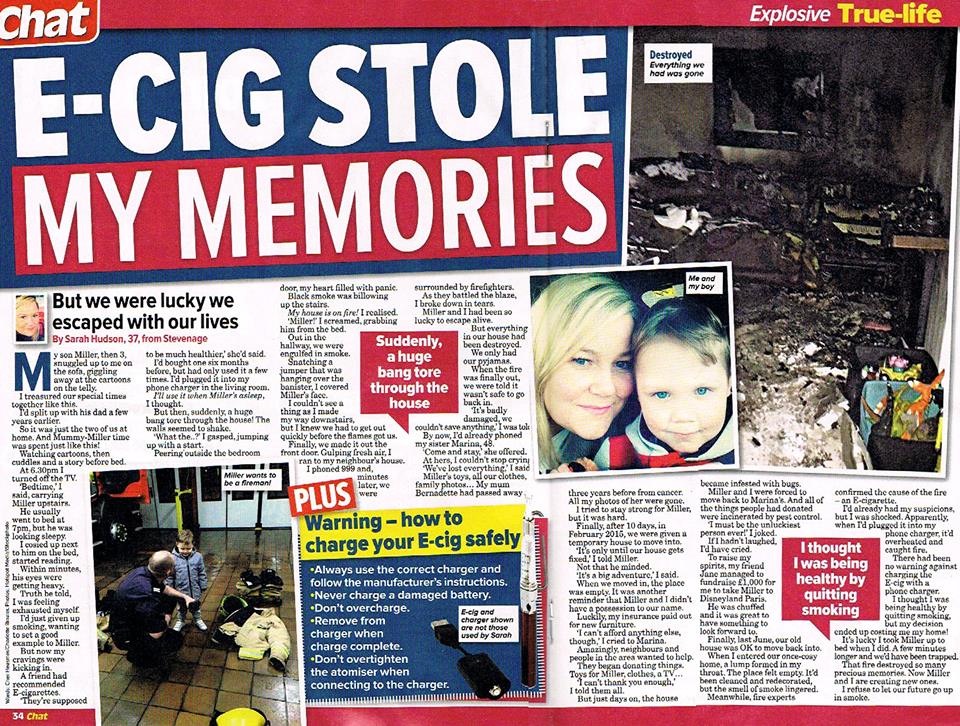 Sarah had just finished reading her son a bed-time story when her house was set on fire by an E-cigarette she had plugged in downstairs. To add insult to injury, Sarah had only given up smoking that day. Thankfully she and her son escaped the fire and are now back in their home. Sarah shared her story in Chat to highlight the potential dangers of charging E-cigarettes.