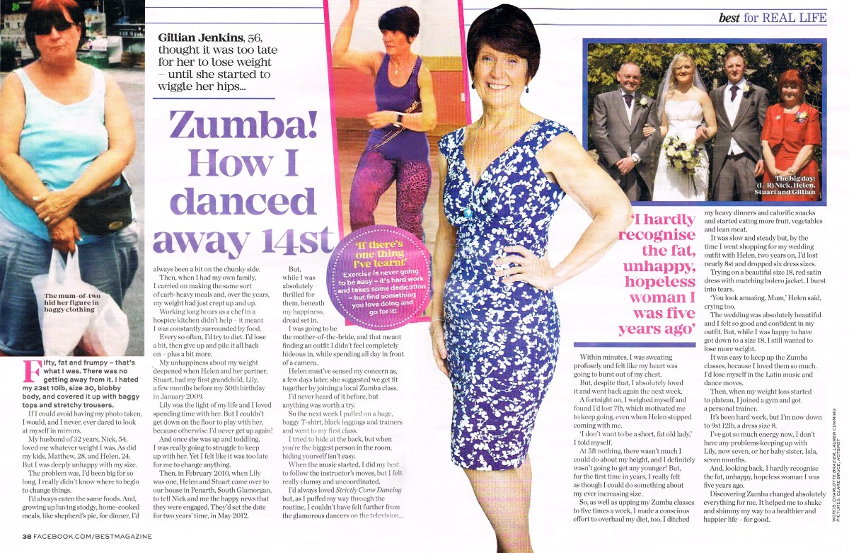 Embarrassed by her 23st 10lb body, Gillian reluctantly agreed to attend a local Zumba class with her daughter, Helen. And she was soon cha-cha-ing her way to slimmer thighs and a flatter stomach. After banishing her beloved cheese and pickles from her kitchen cupboards and attending up to five Zumba classes per week, Gillian shed an astonishing 14st and is now a slinky size 8.
